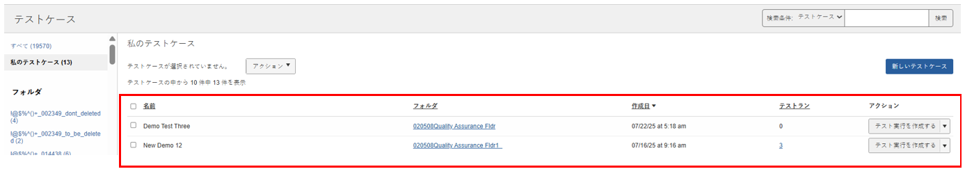新しく作成したテストケースは、テストケース画面に表示されます。 指定したフォルダー(未指定の場合は「Unorganized」)に表示され 入力した名前と製品情報が表示されます。
