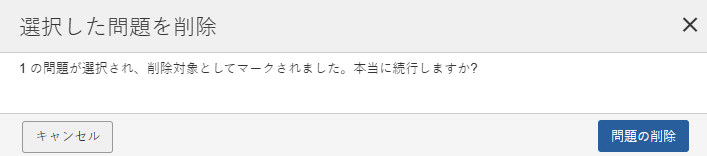 1.Issuesリスト画面で、問題テーブルの左列にあるチェックボックスを任意の数選択し、アクションドロップダウンメニューを開いて、リストから削除オプションを選択してください。 アクションドロップダウンメニューの「削除」オプション 2.確認のポップアップウィンドウで、[Delete Issues]ボタン(または、迷っている場合は[キャンセル])をクリックします。 問題を削除する前の確認 3.画面右上にシステムから成功のメッセージが表示されます。