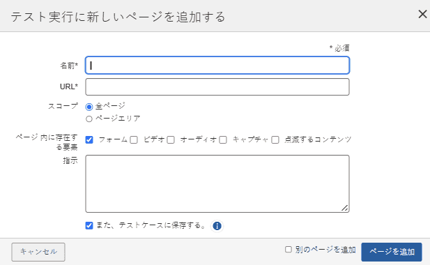1.新しいページを追加ボタンをクリックします。 2.新しいページの名前を指定されたフィールドに入力してください。 3.フィールドにURLを入力してください(または仮想クリップボードから貼り付けてください)。 指定されたフィールド 4.コンポーネント固有: 新しいコンポーネントを追加する際は、必要な情報を入力してください。 追加で必須となるセレクタフィールド(名前が何かに紐付けられている) ページ上でその要素をターゲットとして指定するために使える要素 クラスやIDなどの単純なセレクター、またはセレクターのいずれかです。 パス。CSSのIDを使用する場合は、IDが#で始まっていることを確認してください。 CSSクラス名の場合は、ピリオド(.)で始めます。例: #myidname または .myclassname。詳細については、「CSSセレクター」をご参照ください。 プロセス. 5.必要に応じて、スコープのオプションを選択し、要素のボックスにチェックを入れます。 指示を入力してください。 6.必要に応じて、テストケースにも保存するチェックボックスをオンにします。 7.フォームの右下にあるAdd New Pageボタンをクリックします ダイアログ。