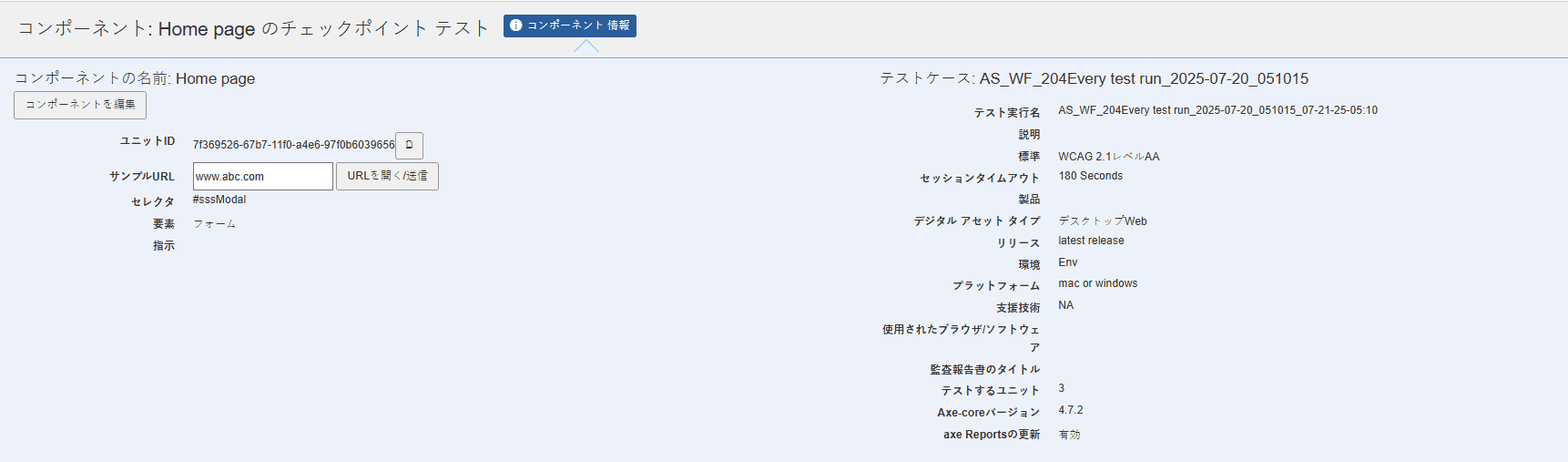 進行中のテスト実行内でのみ、テストケース内の共通コンポーネントを編集できます。テスト実行が完了すると、ユーザーはテスト実行の情報の名称を変更できなくなります。