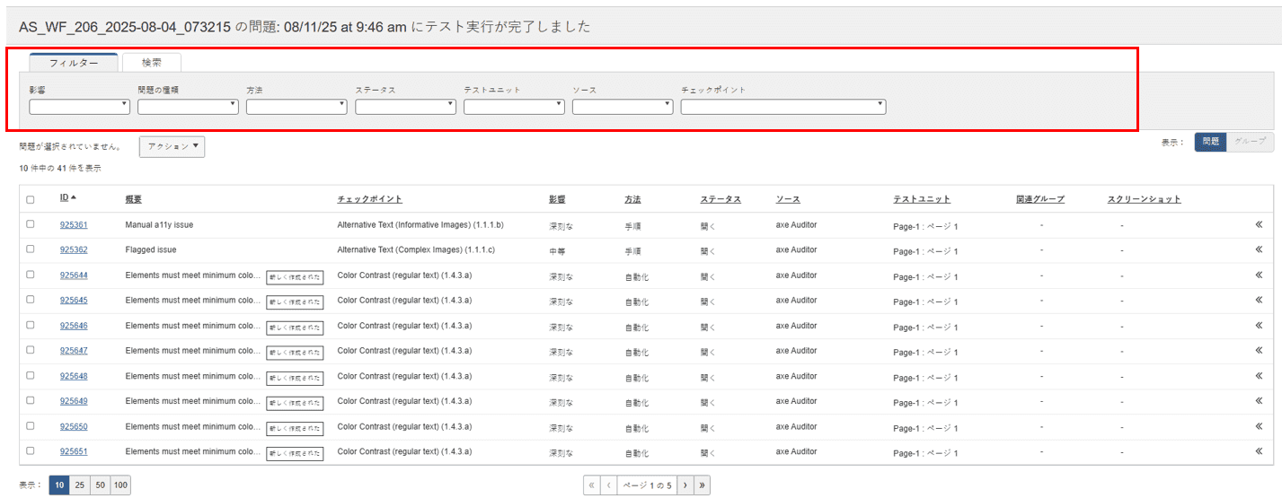 問題一覧画面には、特定のテスト実行で記録された問題に関する関連情報の列が表形式で表示され、結果を簡単に把握できるようになっています。任意の画面の問題にアクセスした後、表示される情報を管理する方法がいくつかあります。 ユーザーインターフェースで利用可能なツールを使って表示内容を制御できます。