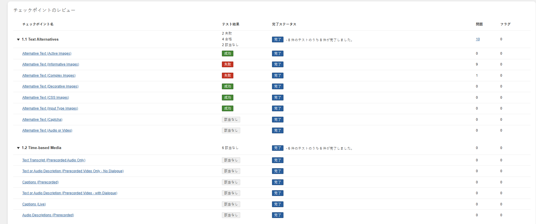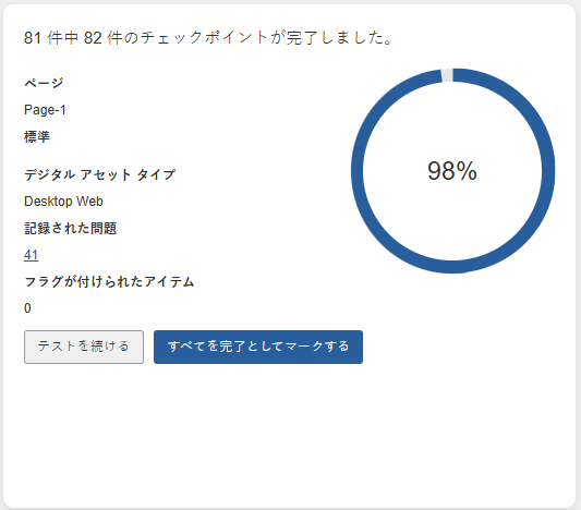 「ページ:<ページ名> のすべてのテストを完了としてマーク」画面が表示されます。結果を確認し、操作を確定してください。