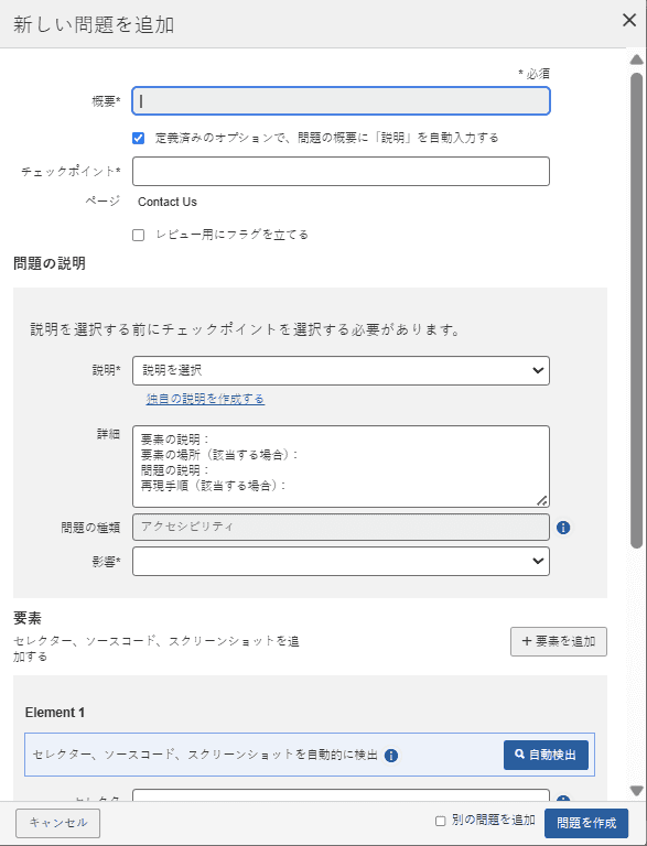 • Auto Detectボタンは、要素のセレクター、ソースコード、スクリーンショットを自動的に検出します。クリックすると、同じブラウザー内で新しいタブにURLが開き、要素を選択できるようになります。選択した要素は自動的に問題に追加されます。