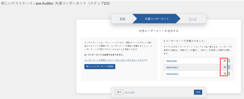 3.必要に応じて、「# 定義されたコンポーネント」テーブル内のページの順序を変更します。 詳細については、コンポーネントの並べ替え(reordering-components)をご参照ください。 4.**「テストケースを保存」**ボタンを有効化してください。