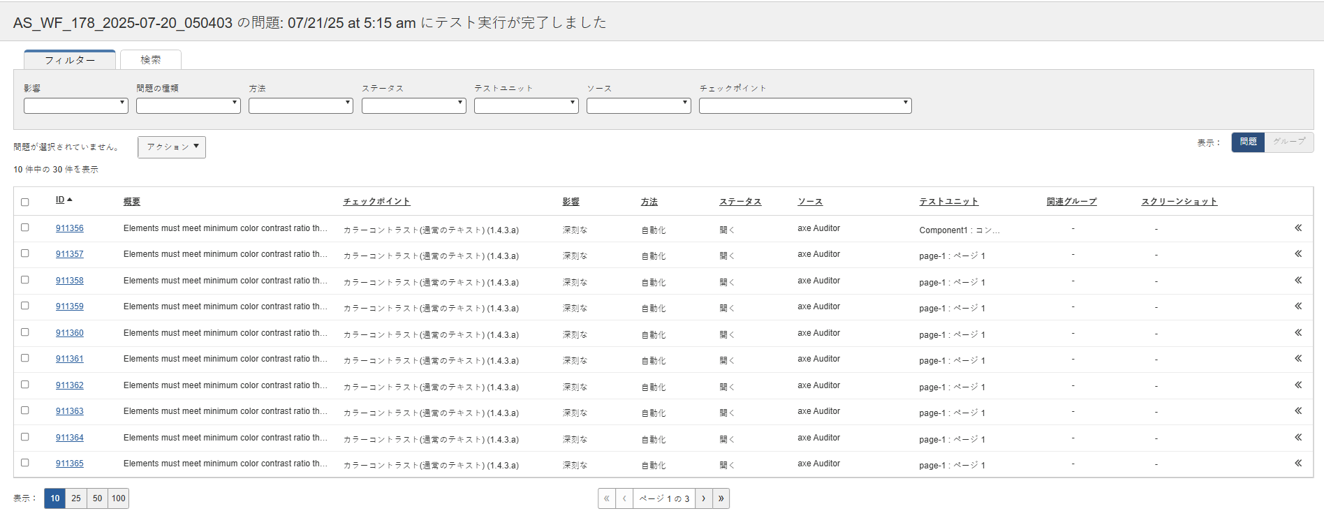 Axe Auditorの問題は、「次の問題」という画面で確認できます。 ** <Test Case Name>**アプリケーションのさまざまな領域からアクセスできます。どのユーザーインターフェイスのエリアから画面にアクセスするかによって、異なるフィルターが自動的に適用され、特定の課題一覧が表示されます。詳細については、[課題の表示]を参照してください。 問題](viewing-issues)。
