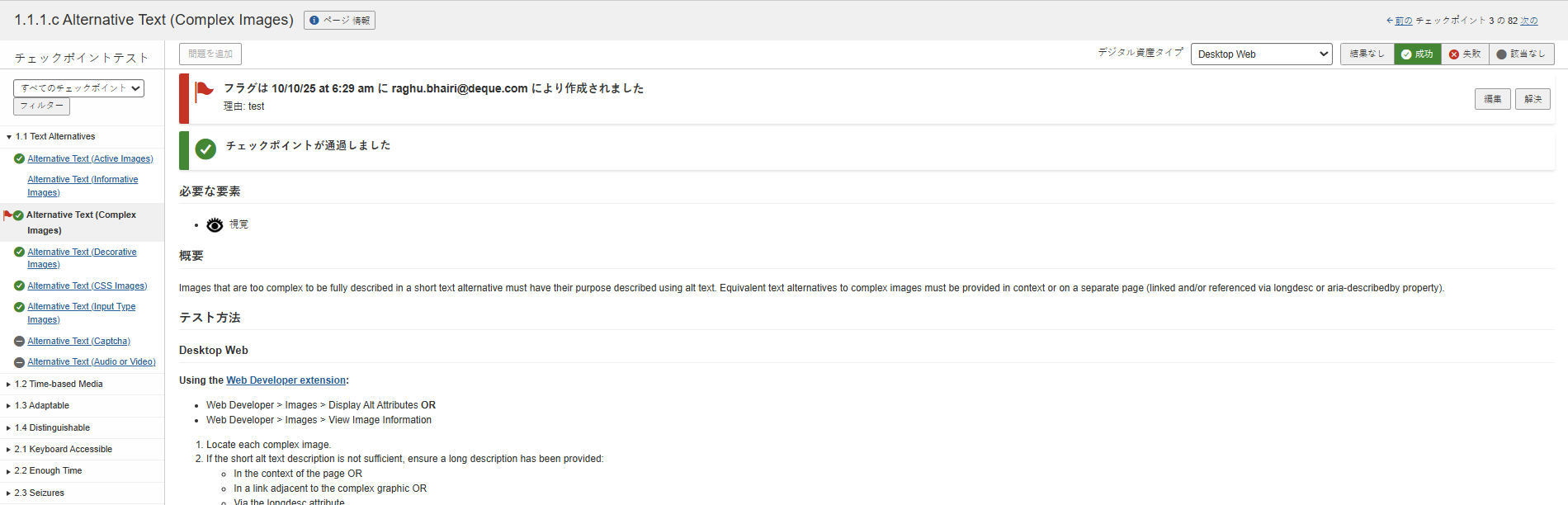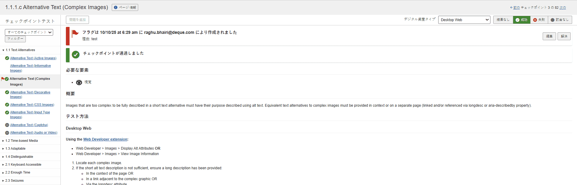 チェックポイント画面には、ホーム画面やテスト実行画面の開始点からアクセスできますが、さらに既存のチェックポイント画面のナビゲーションリンクからもアクセスできます。ここでは専門的なテスト内容を閲覧できます。 方法論ガイダンスを閲覧したり、問題やフラグを追加したり、完了結果を割り当てたりできます。ナビゲーション経路には以下が含まれます: