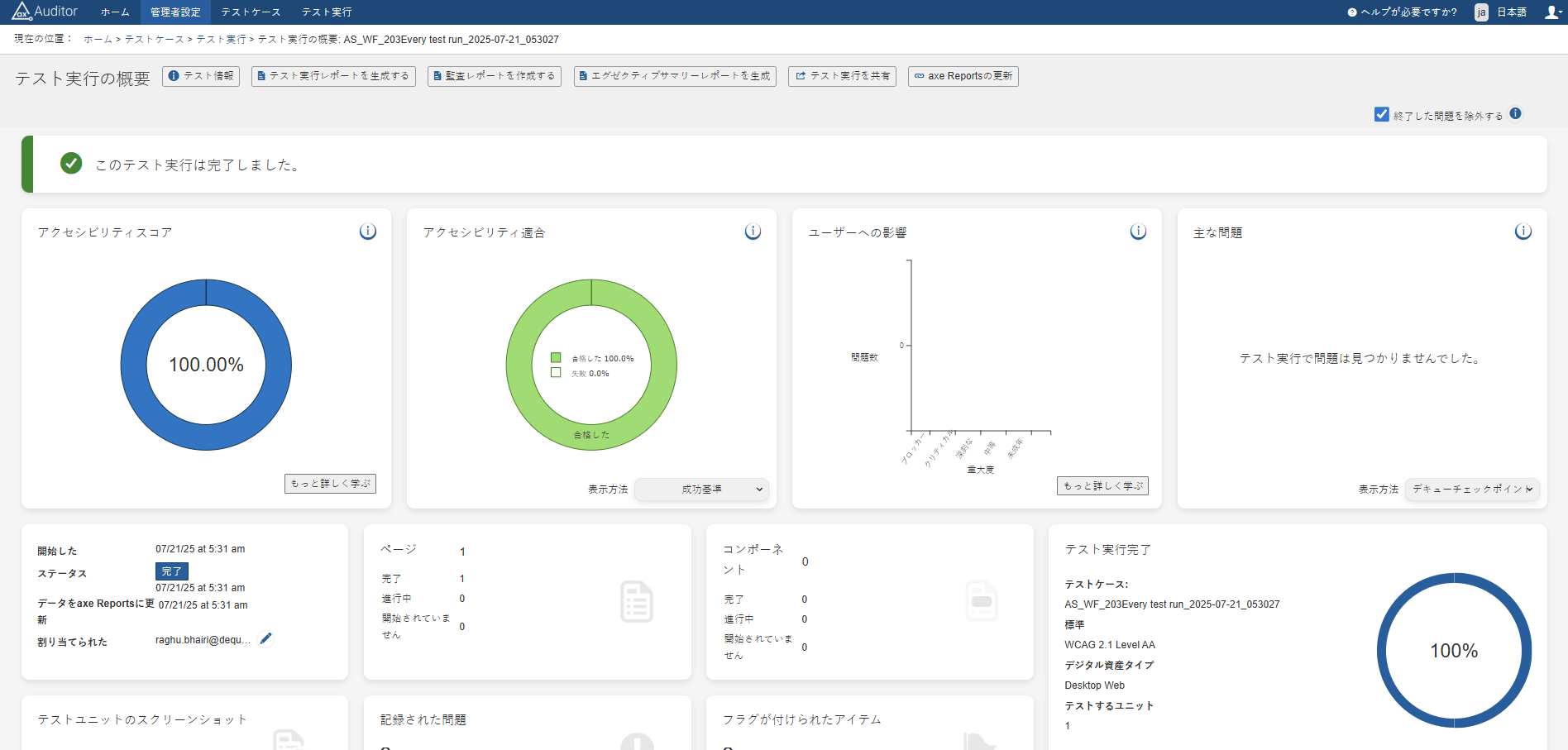 テスト実行の主要情報を表示するダッシュボードが含まれています。表示される情報は、テスト実行のステータスによって異なります。完了したテスト実行の場合、表示される情報には次のものが含まれます。 ・WCAGの成功基準ごとの適合性、ユーザーへの影響ごとの問題数、トップ問題を表示するチャート。