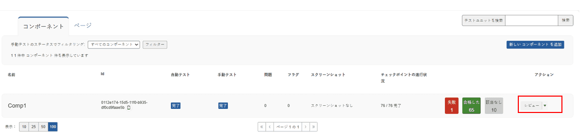 テスト実行の概要画面が表示され、テスト対象の各コンポーネントやページのセクションが(それぞれのコンポーネントタブおよびページタブに)表示されます。これらにはそれぞれ個別の《テストの開始》ボタンがあります。