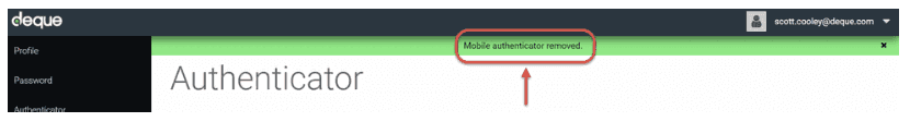 認証画面の最上部に、緑色の背景のシステムメッセージが表示され、削除が正常に完了したことを知らせます。