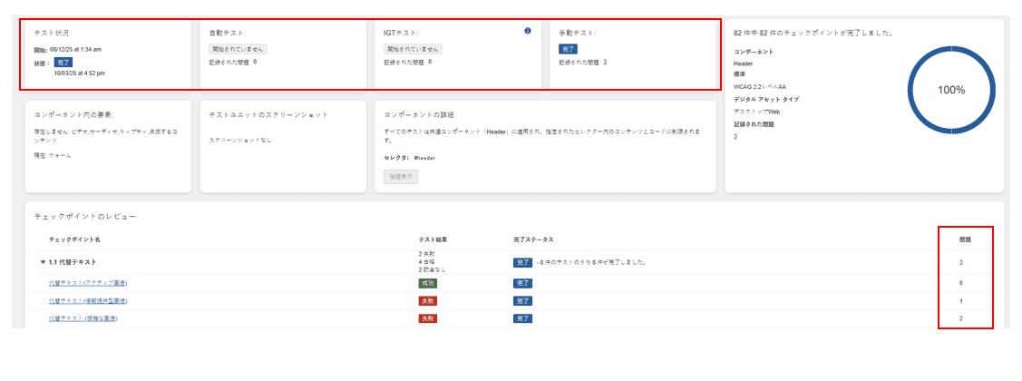 • ページ「<Page Name>」のチェックポイントテスト画面 > テスト状況セクション > 自動テストフィールド:テスト状況セクションの自動テストフィールドで、自動テストの実行によって問題が記録された場合、# 件の問題が記録されましたリンクをクリックすると、そのテスト実行の該当ページで記録されたすべての自動テストによる問題の一覧を表示できます。
