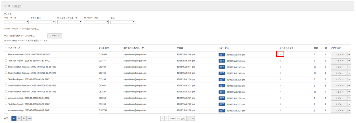 1.テスト実行画面で、関連する問題を確認したいテスト実行の行の「問題」列にある # リンクをクリックします。