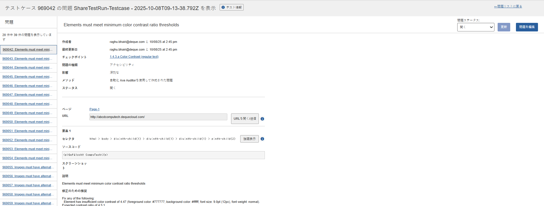 問題表示<#> テストケース用:<Test Case Name> 画面が表示され、個別に記録された問題に関連するすべての詳細と、「問題を編集」「URLを送信」「ハイライト」が可能な便利なボタンが表示されます。