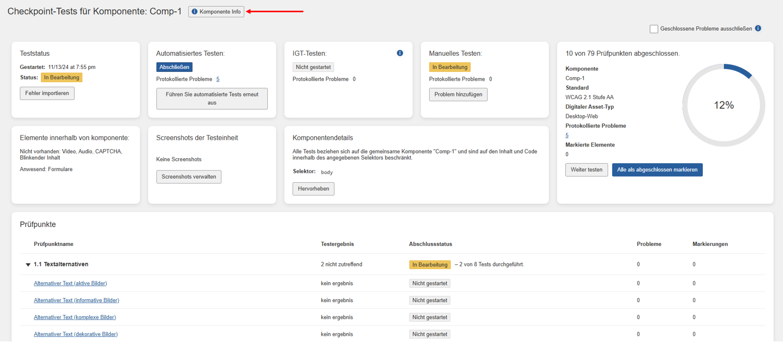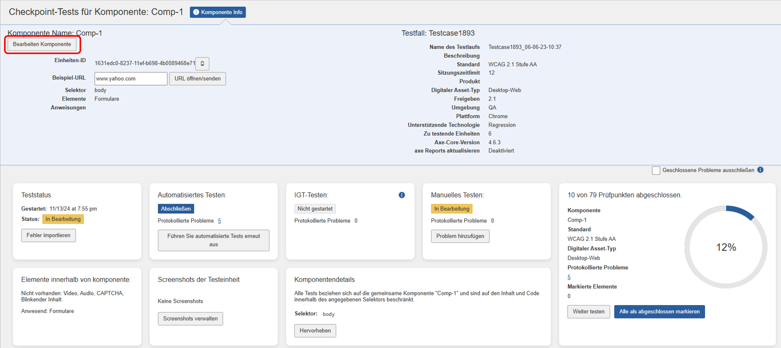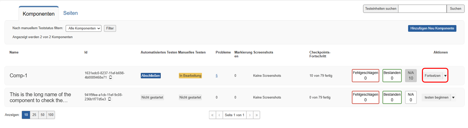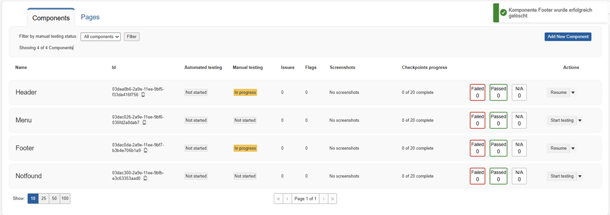 Met een blauwe knop rechtsboven in het paneel Componenten of Pagina's kunt u nieuw toevoegen aan de testrun (en optioneel aan de bijbehorende testcase).