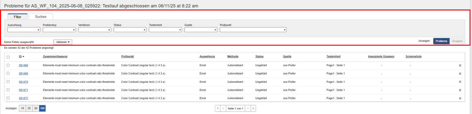 • De filter omvatten Impact, Probleemtype, Methode, Status, Testeenheid, Bron, Groepen en Controlepunt.