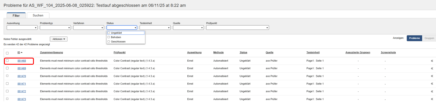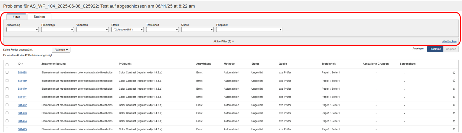 Het bovenste gedeelte van het scherm Problemen voor bevat de volgende filtermenu's (Impact, Probleemtype, Methode, Status, Testeenheid, Bron, Groepen en Controlepunt). Elk van deze menu's functioneert als een vervolgkeuzelijst met selectievakjes waarmee u verschillende criteria kunt selecteren om de informatie in de onderstaande tabel te verfijnen.