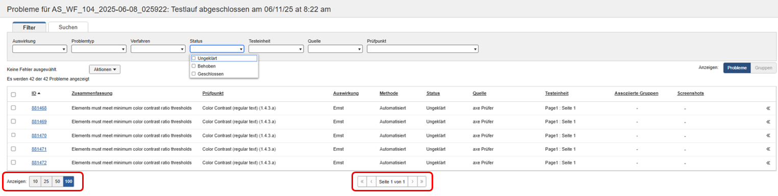 Het scherm 'Problemen voor' is eenvoudigweg een tabel met meerdere kolommen met informatie over elke probleemrij (#, Samenvatting, Impact, Methode, Status, Testeenheid, Gekoppelde groepen, Schermafbeeldingen, Voorbeeld), met filter- en zoekopties bovenaan en opties voor de paginaweergave onderaan.