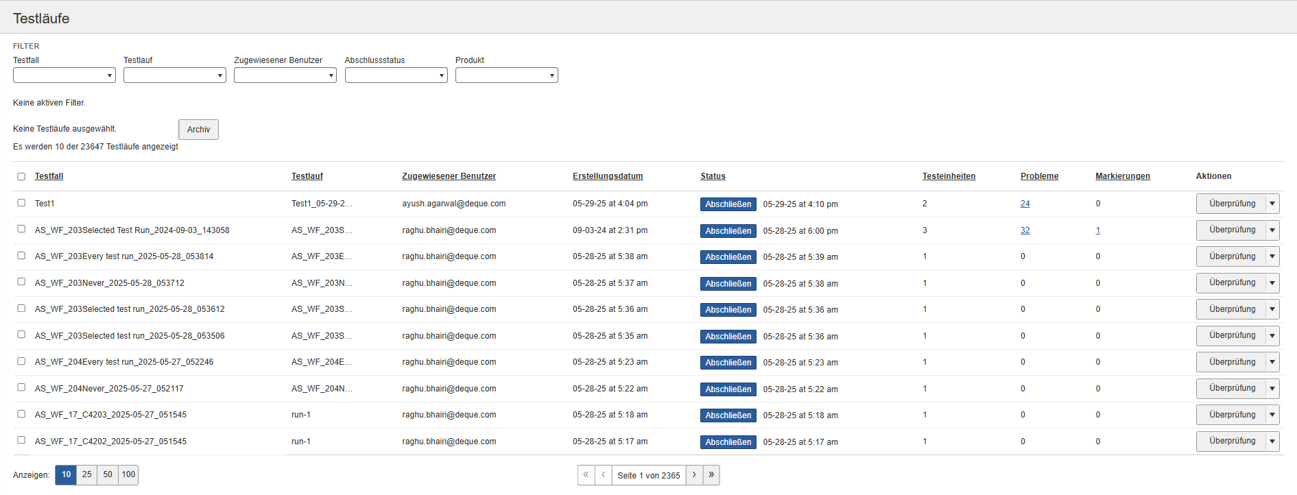 Het scherm Testruns biedt samenvattende informatie over alle testruns in het systeem. Hiermee kunt u de volgende kolommen met belangrijke informatie over elke testrun bekijken: