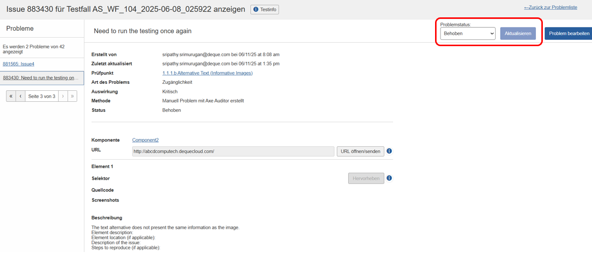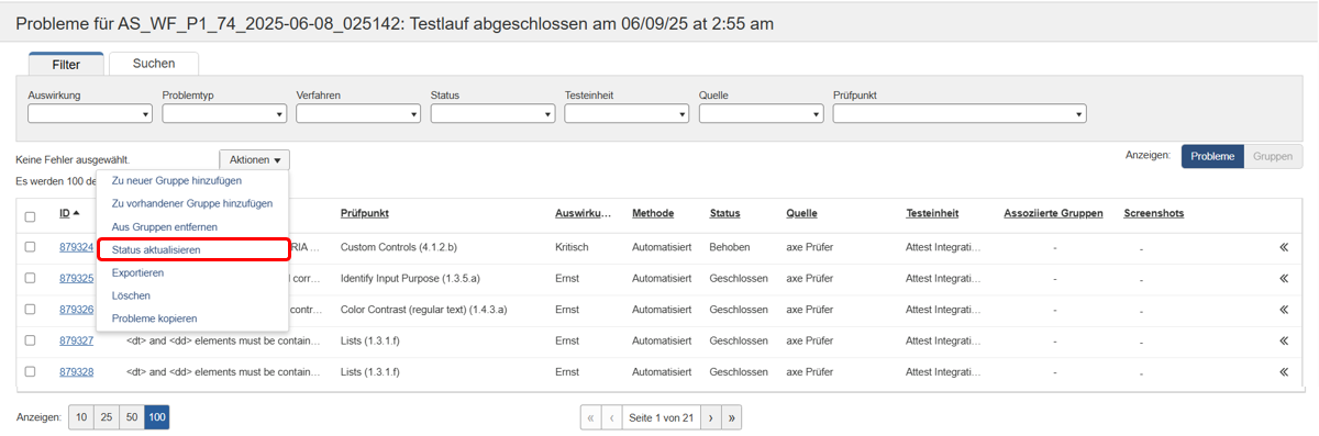U kunt de status van bestaande problemen bijwerken. U start de statusupdate van het probleem door de vervolgkeuzelijst te gebruiken of door met de rechtermuisknop op de afzonderlijke problemen te klikken.
