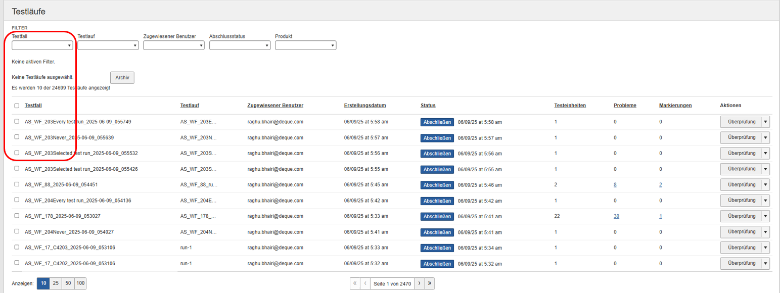 Het scherm Testruns wordt weergegeven, met een filter toegepast op de testcase: