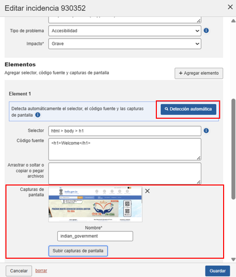 Puede agregar capturas de pantalla utilizando la función de detección automática, la función de arrastrar y soltar o copiar y pegar, o la función de cargar capturas de pantalla desde su sistema a la incidencia para un punto de control.