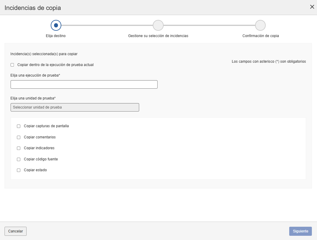 Seleccione la casilla de verificación Copiar dentro de la ejecución de prueba actual, si desea copiar los problemas seleccionados dentro de la misma ejecución de prueba.