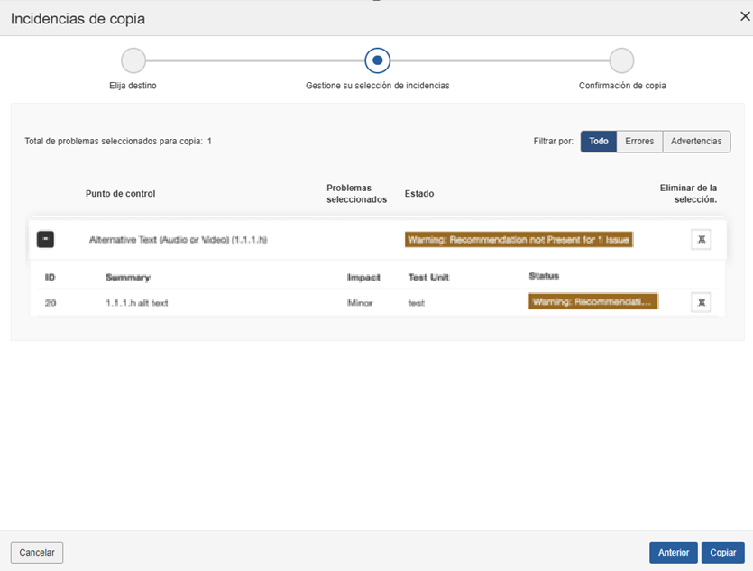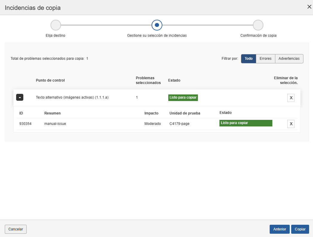 Si el botón Copiar está habilitado, puede continuar y copiar los problemas (puntos de control). También puede ampliar la lista de puntos de control y seleccionar las unidades de prueba individuales que se copiarán de la lista específica.