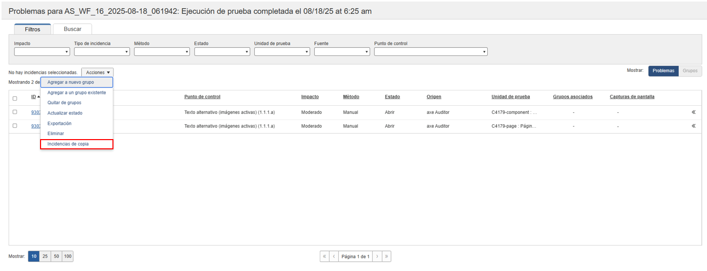 Puede copiar problemas existentes de una ejecución de prueba a otra, o dentro de ejecuciones de prueba. Para iniciar la copia del problema, utilice el menú desplegable o haga clic derecho en los problemas individuales.
