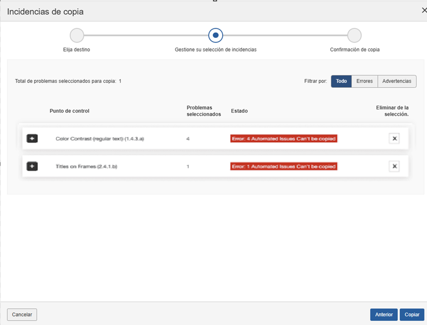 Active el botón Copiar para pasar a la siguiente pantalla. El botón Copiar se habilita solo después de haber eliminado todos los puntos de control con errores.
