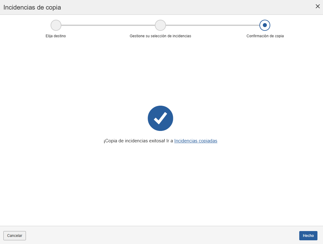 En la pantalla Confirmación de copia, se copian las incidencias y se muestra la confirmación. Utilice el enlace Ir a incidencias para ir a las incidencias copiadas.