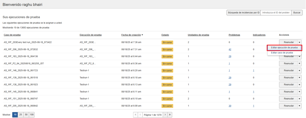 - En la columna Acciones, haga clic en down arrow para expandir el menú del botón desplegable, luego haga clic en Edit test run dentro de la fila del caso de prueba que desea editar.