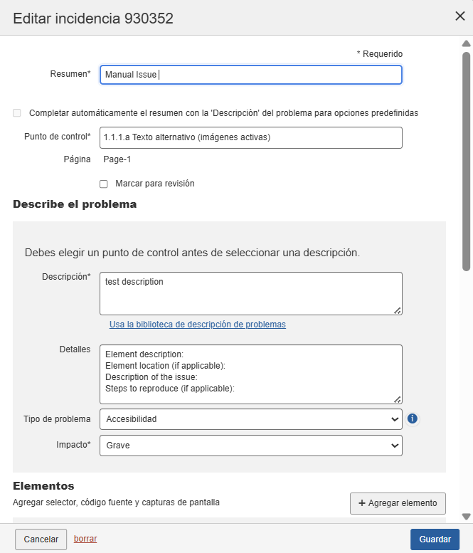 - Realice cambios en los campos editando entradas de texto, cambiando selecciones y/o cargando/eliminando capturas de pantalla. También puede utilizar la función Auto Detect para agregar elementos automáticamente para problemas manuales.