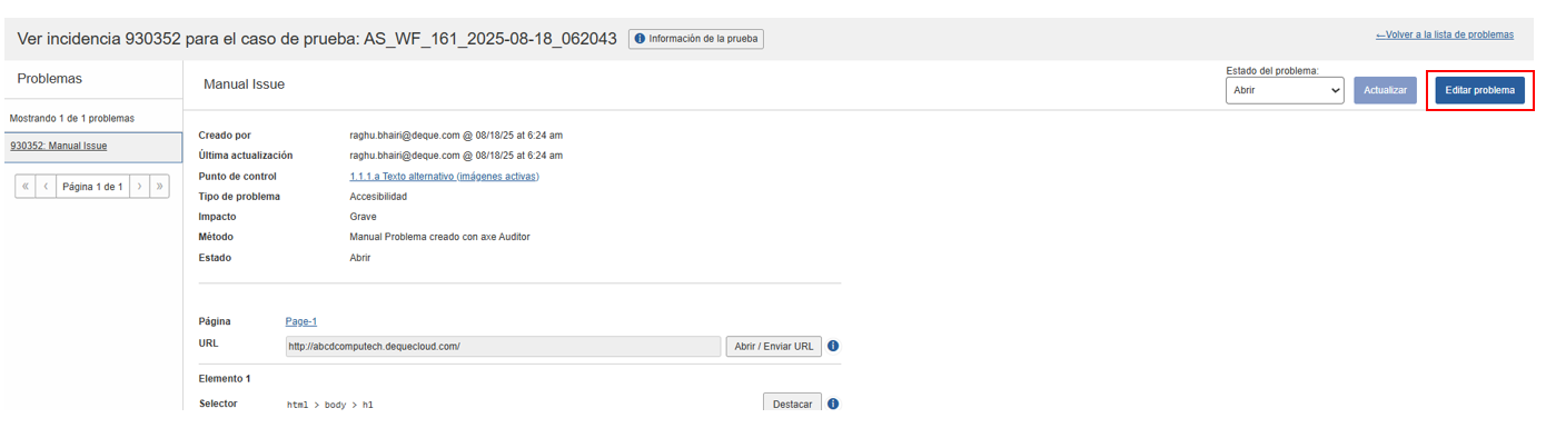 La página Detalles de la Incidencia proporciona un botón Editar Incidencia que hace que aparezca el cuadro de diálogo Editar Incidencia. En el cuadro de diálogo Editar Incidencia, puede editar la información de la Incidencia existente, incluido el Resumen, el Punto de control, el Tipo de Incidencia, el Tipo de descripción, la Descripción, el Código fuente, el Impacto, el Motivo de la bandera, la Captura de pantalla y las Notas, ya sea cambiando las entradas de texto existentes, las selecciones de la lista del menú o los archivos de imagen cargados y luego haciendo clic en un botón para guardar esos cambios.