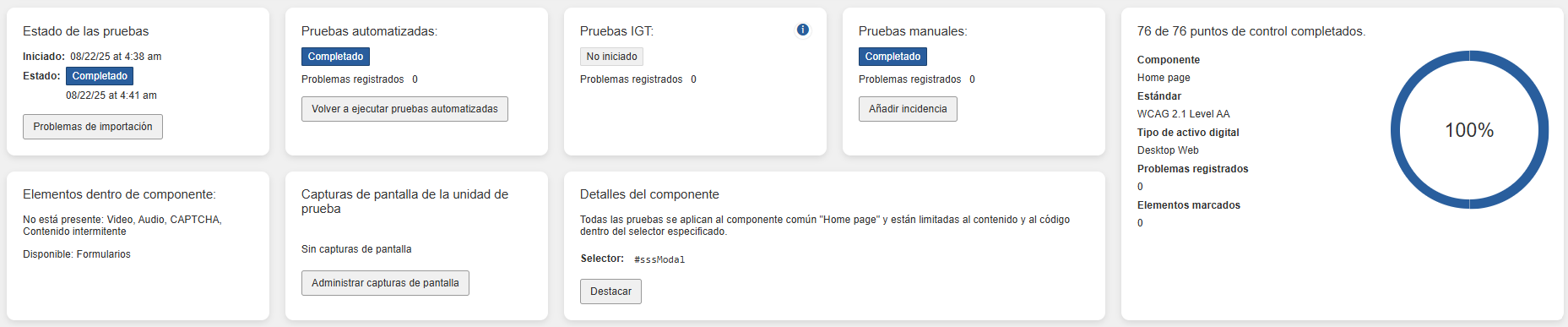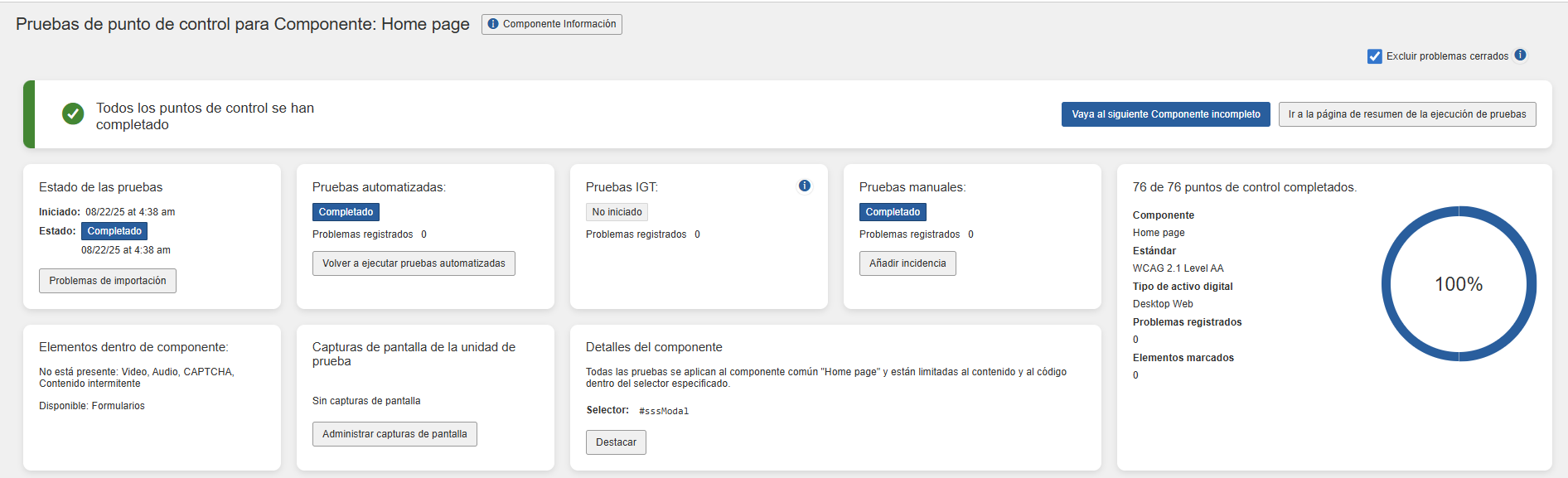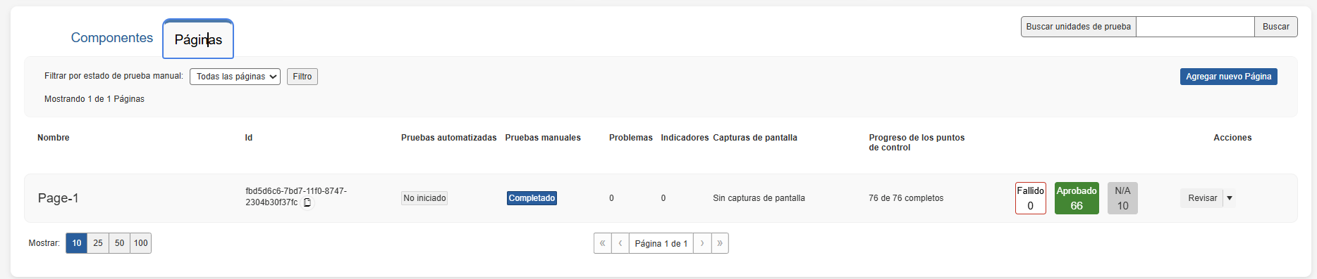 Action button: Dependiendo del estado, el comando apropiado aparece en la etiqueta (No iniciado > Iniciar pruebas, En progreso > Reanudar, Completado > Revisar). Para obtener instrucciones completas para cada uno, consulte Comenzar a probar un componente o una página, Reanudar la prueba de un componente o una página en progreso y Revisar la prueba completada de un componente o una página.