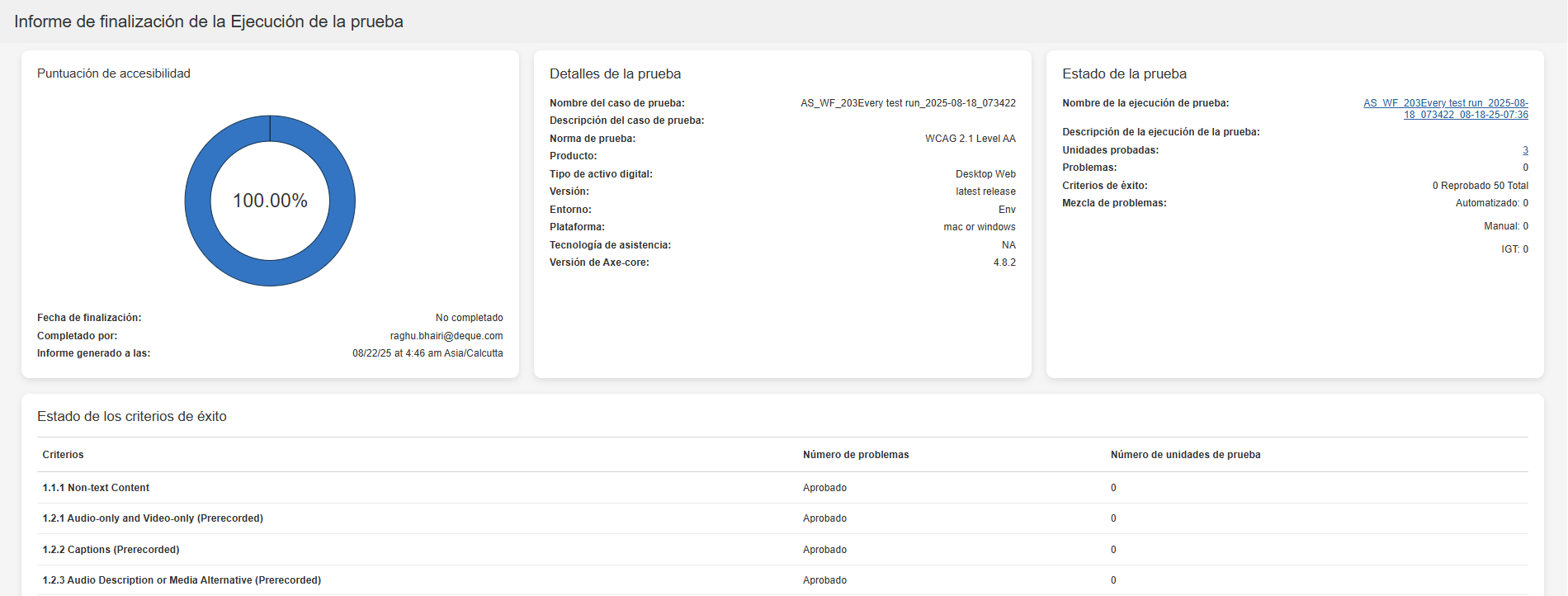 Note: El botón Generate Test Run Report aparece en la página Descripción general de ejecución de prueba solo cuando los estándares de prueba seleccionados son WCAG, EN o Trusted Tester.