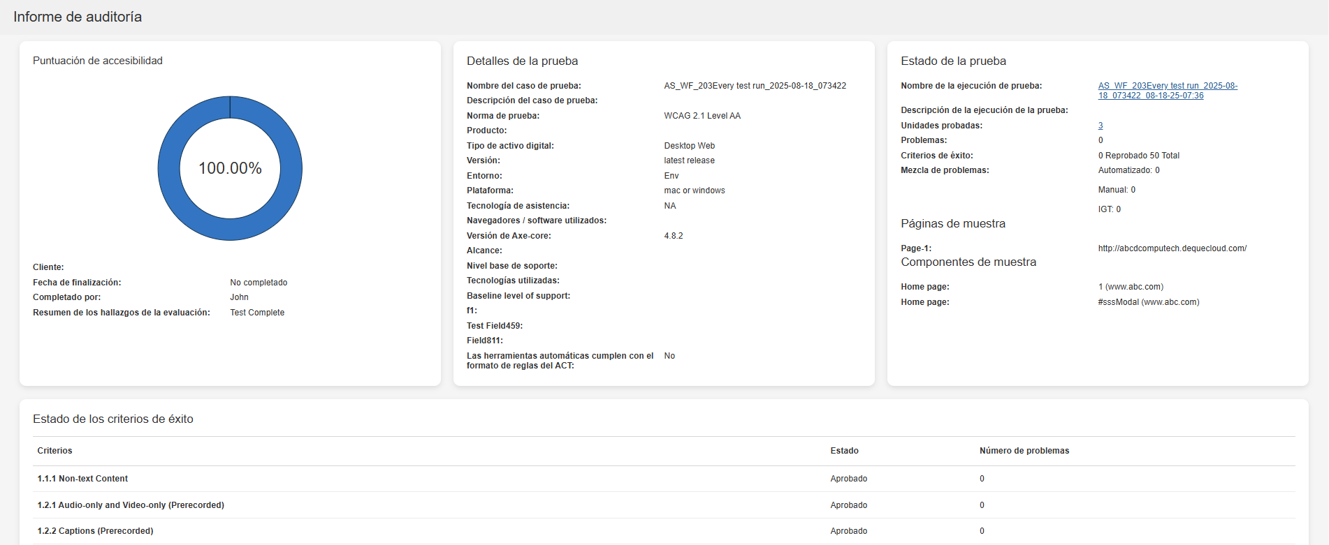 Accessibility Conformance: El gráfico de conformidad de accesibilidad refleja la conformidad de su producto con los estándares y pautas de accesibilidad. Muestra el número de evaluaciones aprobadas o reprobadas según su selección: Criterios de éxito o Puntos de control Deque. La vista predeterminada es Criterios de éxito.
