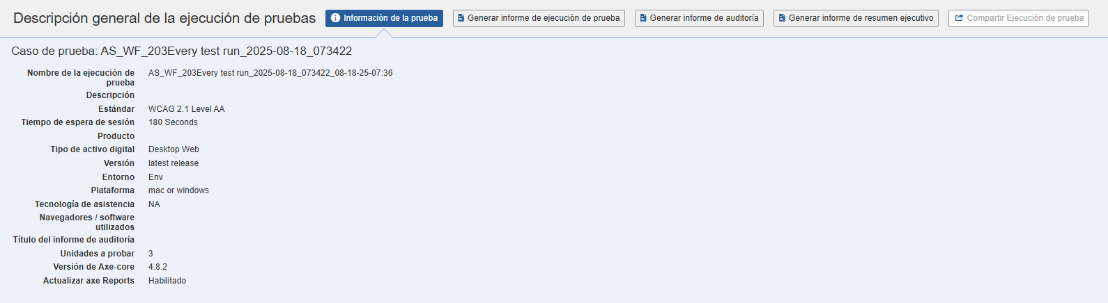 Test Info button:Amplía una sección de referencia útil de la información a continuación que muestra detalles adicionales sobre esta ejecución de prueba, como su descripción, estándar, sesión, tiempo de espera, producto, versión, entorno, plataforma, tecnología de asistencia y unidades a probar.