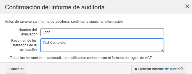 Generate Audit Report: Utilice esta opción para generar el informe de auditoría una vez finalizada la ejecución de la prueba. Al hacer clic en la opción Generate Audit Report , se muestra el cuadro de diálogo Audit Report Confirmation donde puede ingresar el nombre del evaluador y marcar la casilla All automated tools used comply with the ACT rule format .