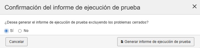 Generate Test Run Report button: Utilice el botón para ver e imprimir un informe HTML de las ejecuciones de prueba completadas. Al hacer clic en el botón Generate Test Run Report , aparece un cuadro de diálogo de confirmación donde puede decidir si desea generar el informe con o sin problemas cerrados.