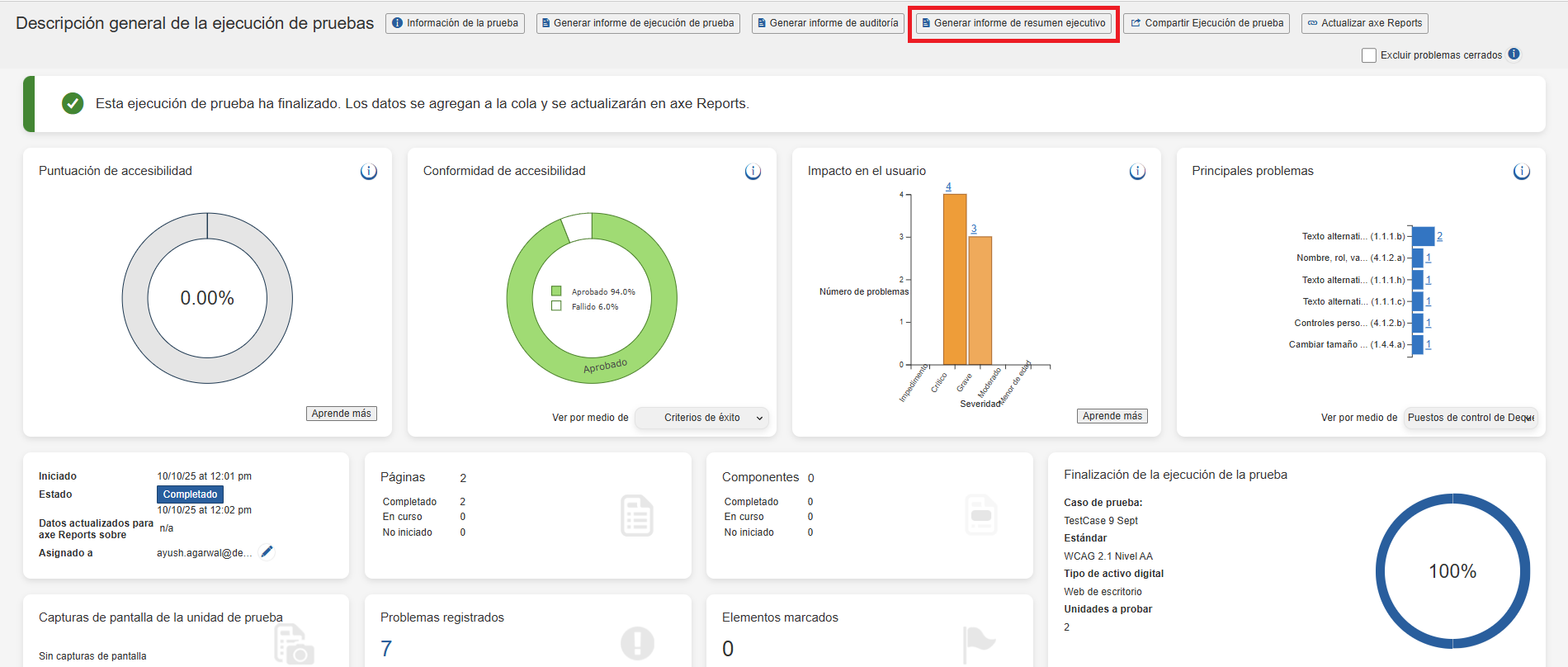 Genere un informe de resumen ejecutivo de alto nivel desde la página Descripción general de ejecución de pruebas (cuando lo habilitan los administradores). Este informe está diseñado para líderes y partes interesadas que necesitan información sobre accesibilidad sin detalles técnicos.