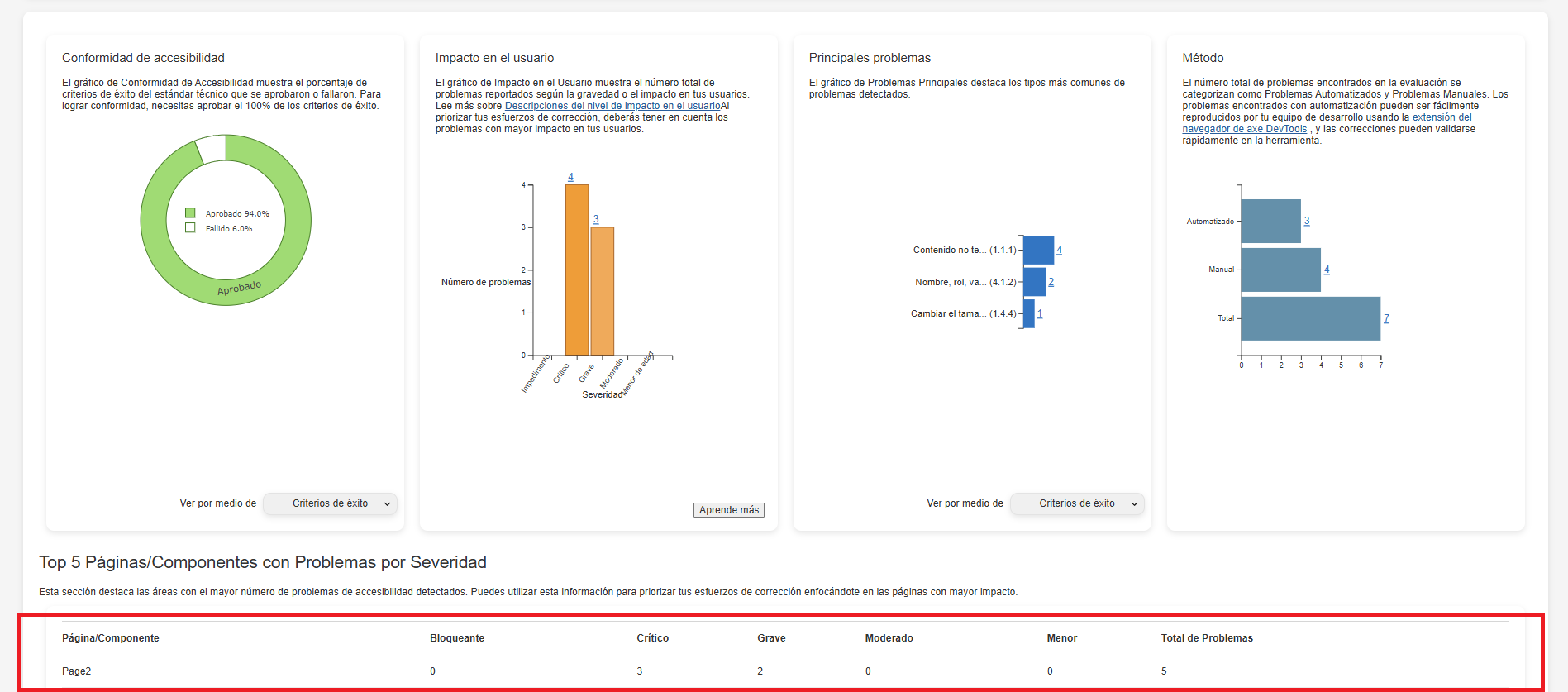 - Resumir las 5 páginas o componentes principales afectados, priorizados por gravedad del problema (Bloqueante → Menor).