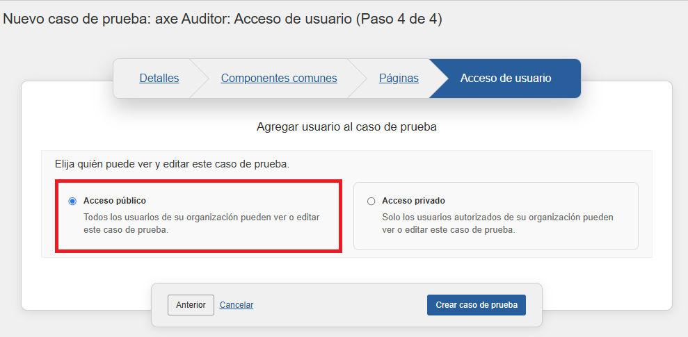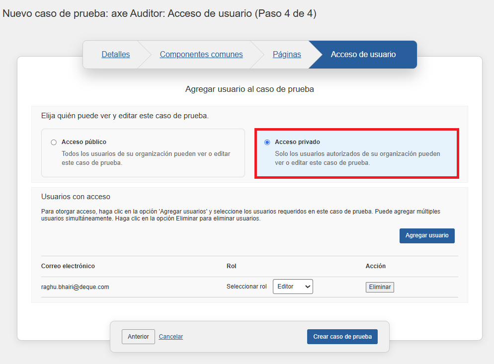 Control de acceso de usuarios para casos de prueba y ejecuciones de pruebas