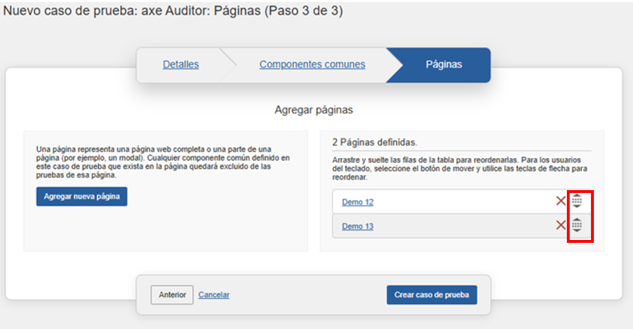 En el panel Páginas de la pantalla Editar caso de prueba: Páginas (Paso 3 de 3), en la sección Páginas definidas, active el icono move a la derecha de la página que desea mover. Este es un icono de 'arrastrar' con flechas hacia arriba y hacia abajo al que también puedes llamar botón de 'mover' o de 'reordenar' .