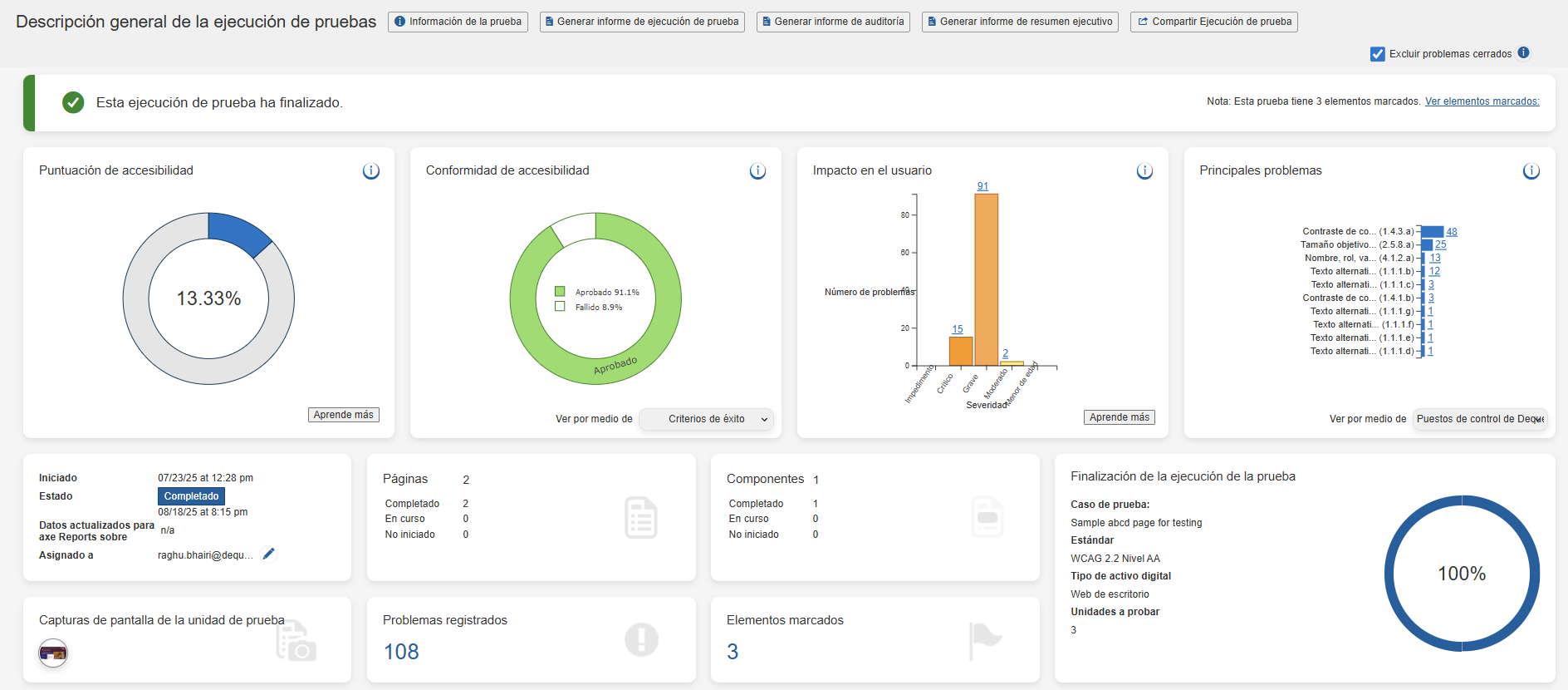 • Gráficos que muestran el cumplimiento de los criterios de éxito WCAG, el número de problemas por impacto en el usuario y los principales problemas