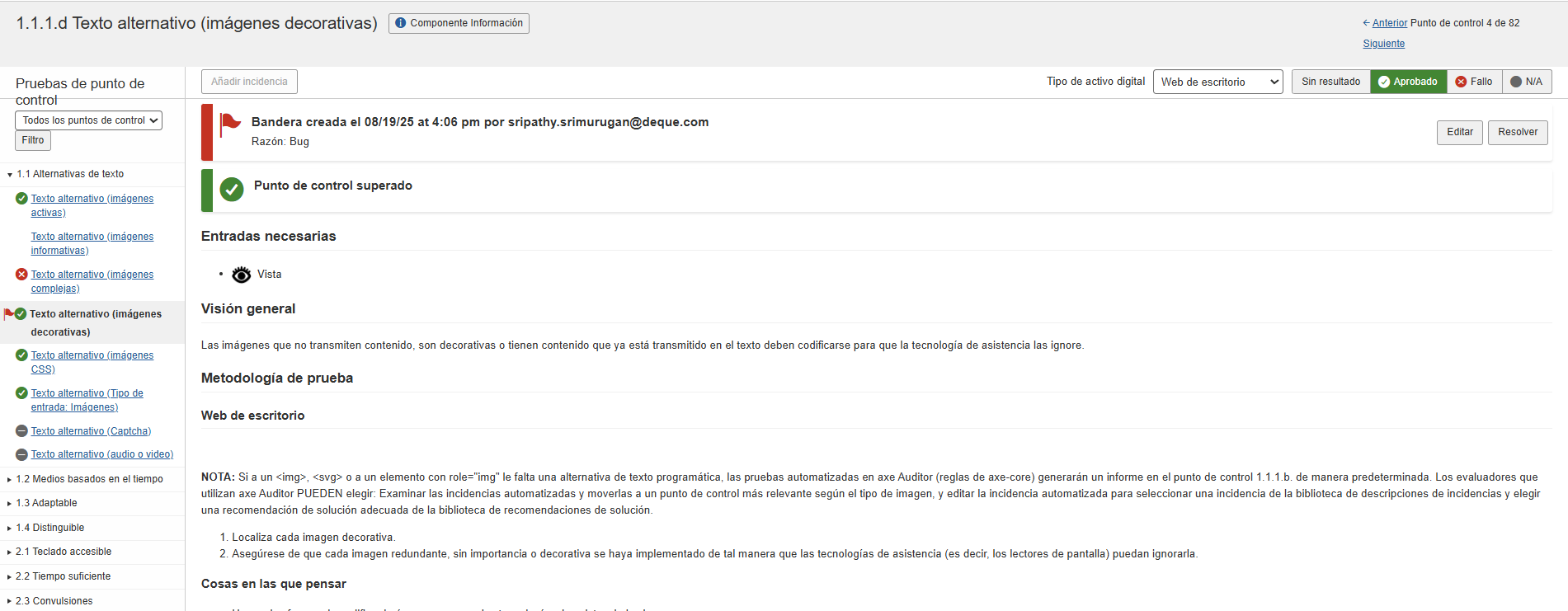 • Sección que muestra capturas de pantalla, problemas registrados y cualquier elemento marcado