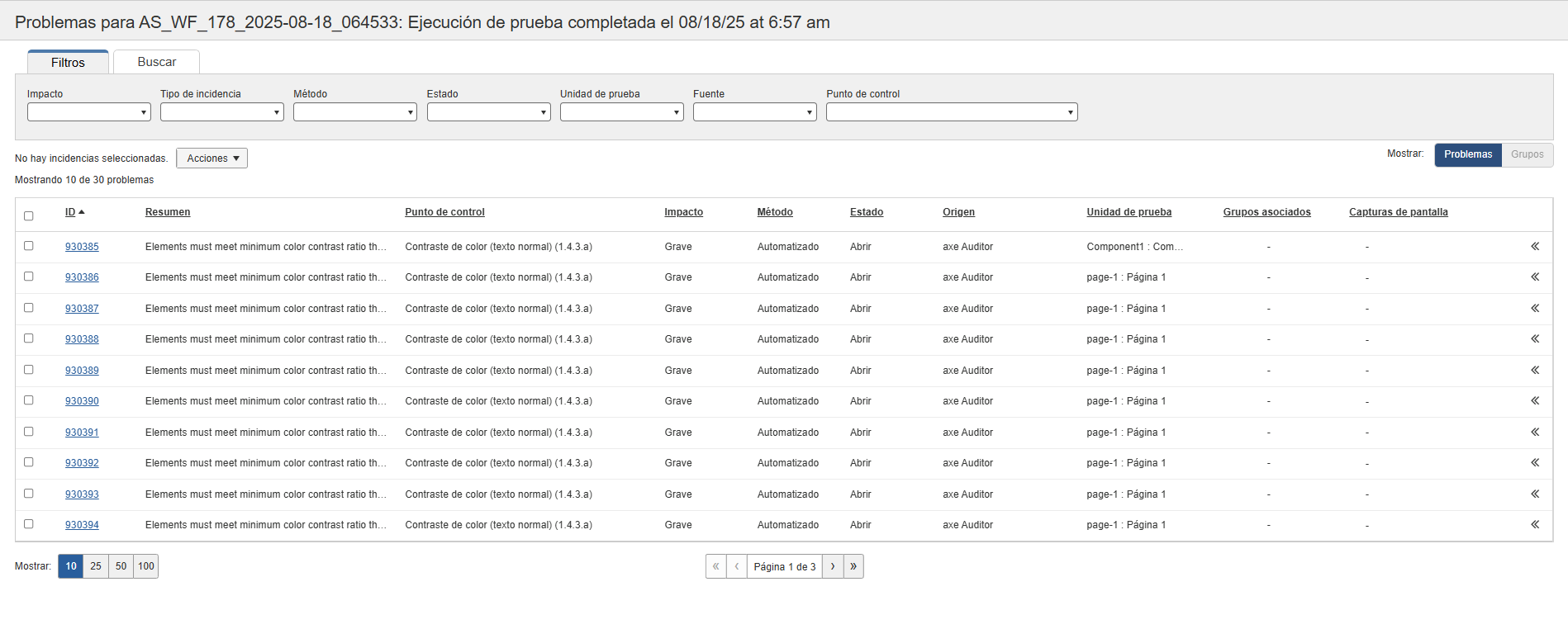 Los problemas en axe Auditor se pueden ver en una pantalla llamada Problemas para: <Test Case Name>, a la que se puede acceder desde numerosas áreas de la aplicación. Dependiendo del área de la interfaz de usuario desde la que se accede a la pantalla, se aplican automáticamente diferentes filtros para mostrar una lista específica de problemas. Para obtener más información, consulte Visualización Problemas.