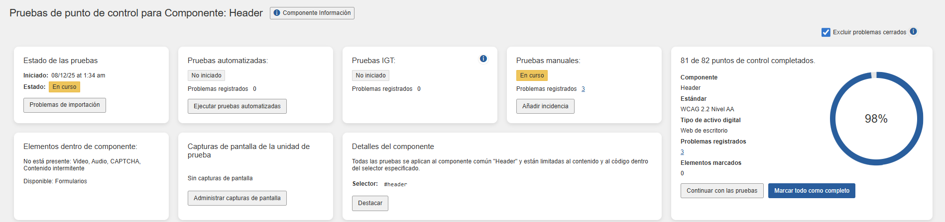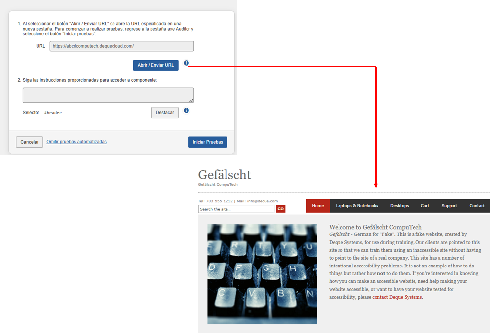 Ejemplo de pantalla de preparación de una página para pruebas automatizadas y manuales