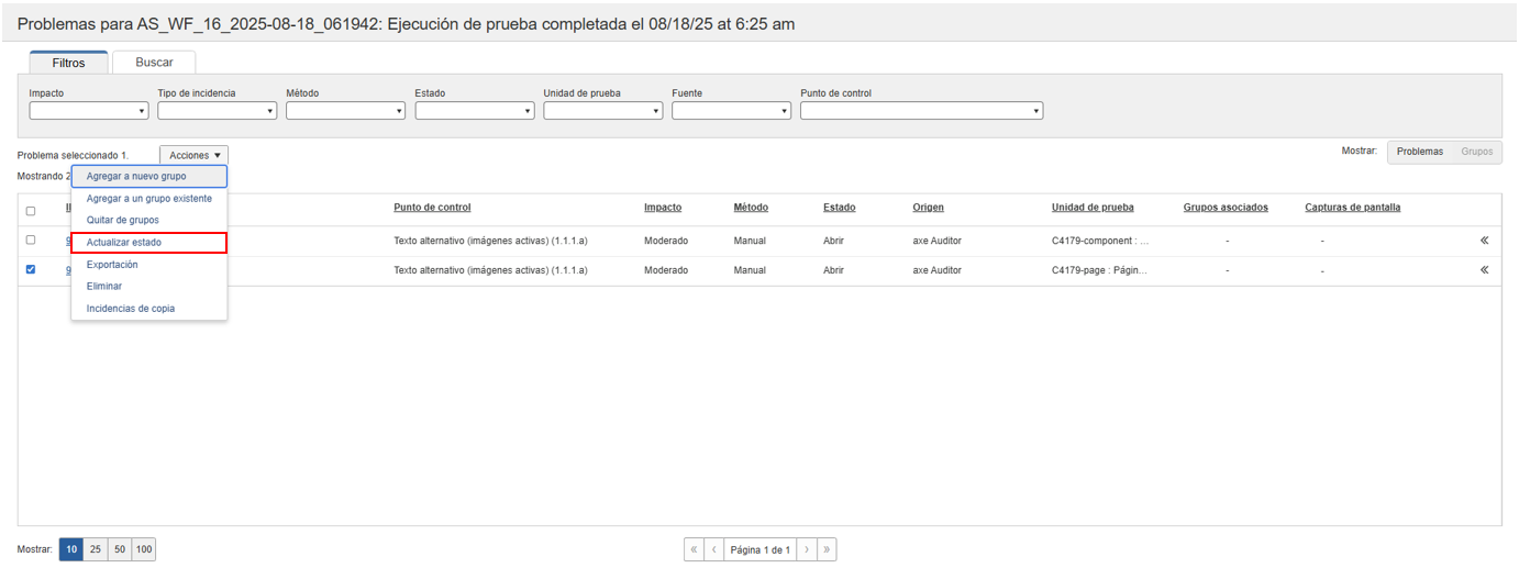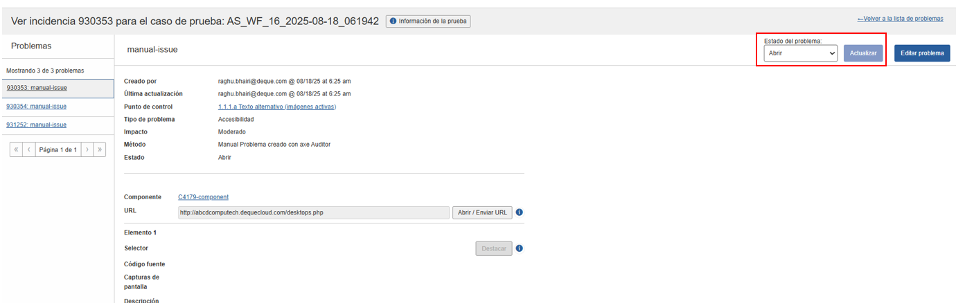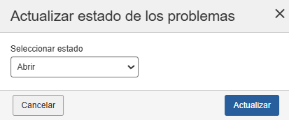 Puede actualizar el estado de los problemas existentes. Puede iniciar la actualización del estado del problema utilizando el menú desplegable o haciendo clic derecho en los problemas individuales.