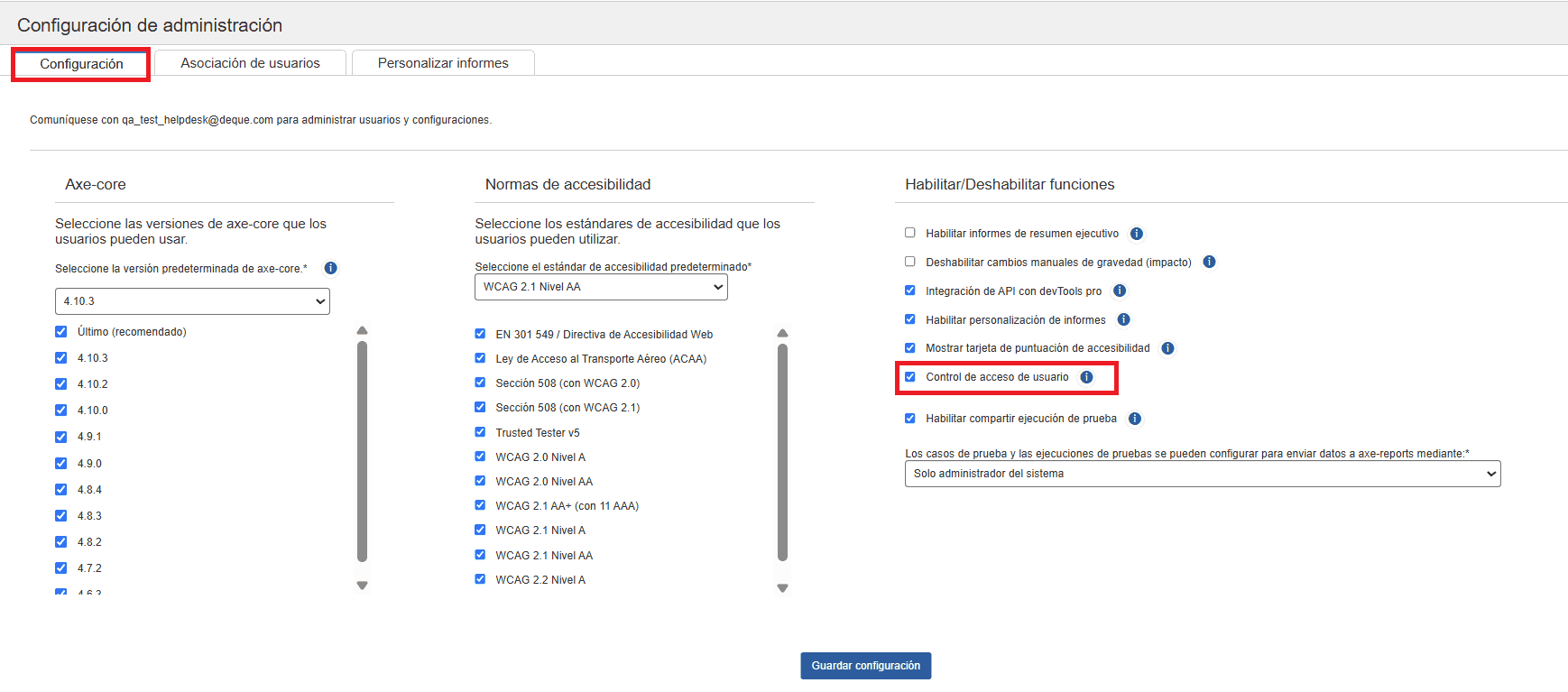 Esta opción estará disponible en la página Nuevo caso de prueba solo cuando el administrador habilite la opción Control de acceso de usuario en la página Configuración de administrador. Para habilitar esta opción, vaya a ** Configuración de administrador** > ** Ajustes** > ** Control de acceso de usuario** en la sección ** Habilitar/deshabilitar funciones**, luego seleccione ** Guardar configuración**.