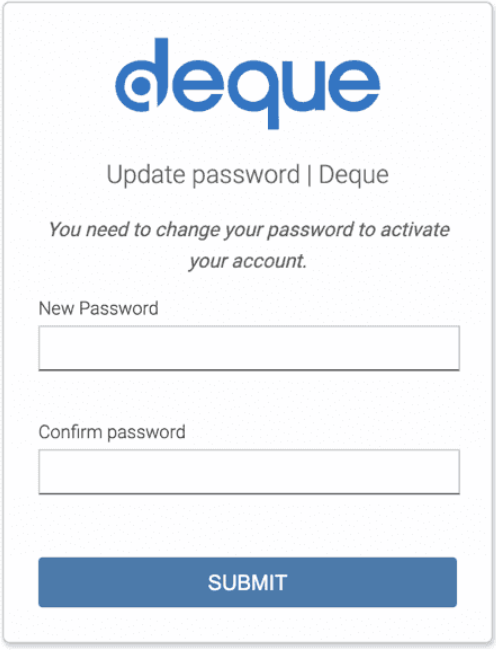 Lorsqu'un nouveau compte a été créé pour vous permettre d'utiliser axe Auditor par l'administrateur système de votre organisation (ou dans de nombreux cas, par le personnel administratif de Deque), votre compte sera établi avec un nom d'utilisateur et un mot de passe. Cependant, lors de la première connexion avec ces informations d'identification, il peut vous être demandé de réinitialiser votre mot de passe ou d'effectuer une autre action. Cela est à la discrétion de l'administrateur.