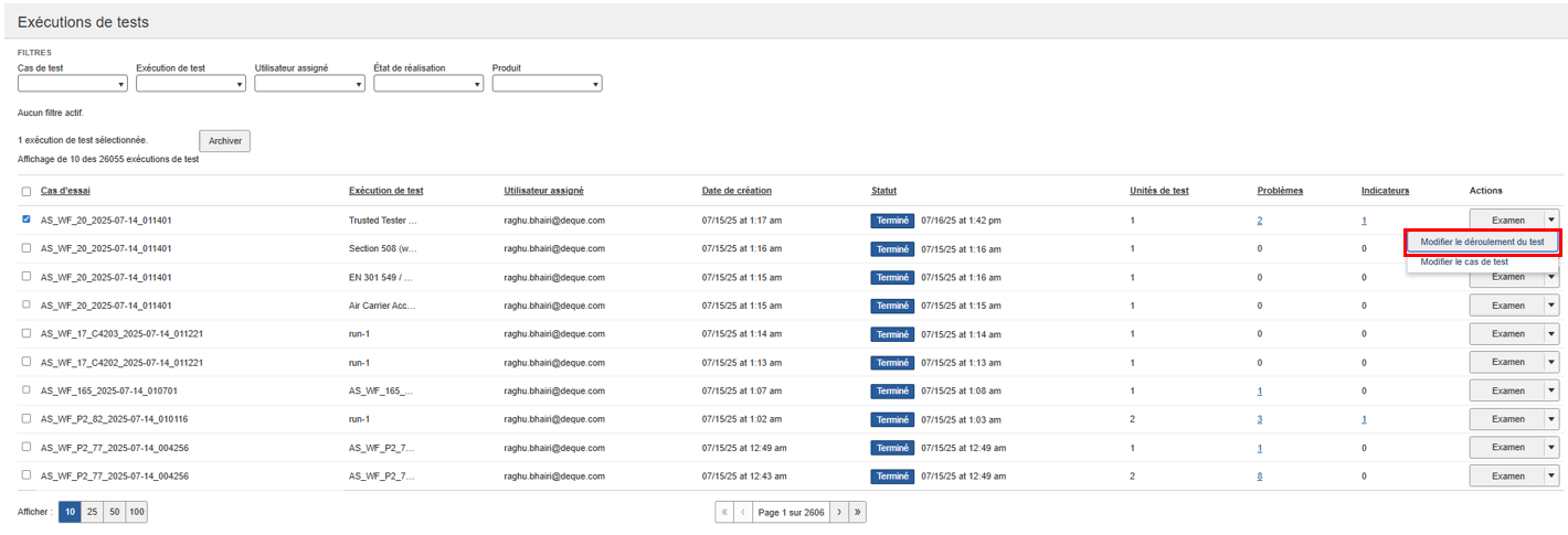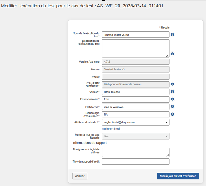 Modification d'une exécution de test (à partir d'une exécution de test)